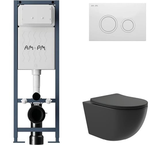 Комплект AM.PM I012711.0101 ErgoFit инсталляция для унитаза с клавишей ErgoFit L пластик, белый глянцевый + унитаз Long 525х360 безободковый, Vortex (Торнадо), сиденье Soft-Close, черный матовый, овал I012711.0101OV2140