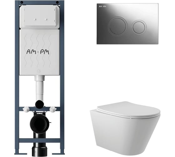 Комплект AM.PM I012711.0151 ErgoFit инсталляция для унитаза с клавишей ErgoFit L пластик, хром глянц + унитаз Long 525х360 безободковый, Vortex (Торнадо), сиденье Soft-Close, белый матовый, конус I012711.0151CV2120
