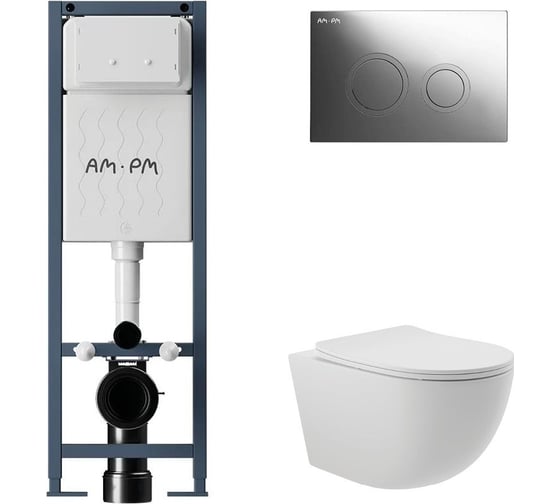 Комплект AM.PM I012711.0151 ErgoFit инсталляция для унитаза с клавишей ErgoFit L пластик, хром глянц + унитаз Long 525х360 безободковый, Vortex (Торнадо), сиденье Soft-Close, белый матовый, овал I012711.0151OV2120