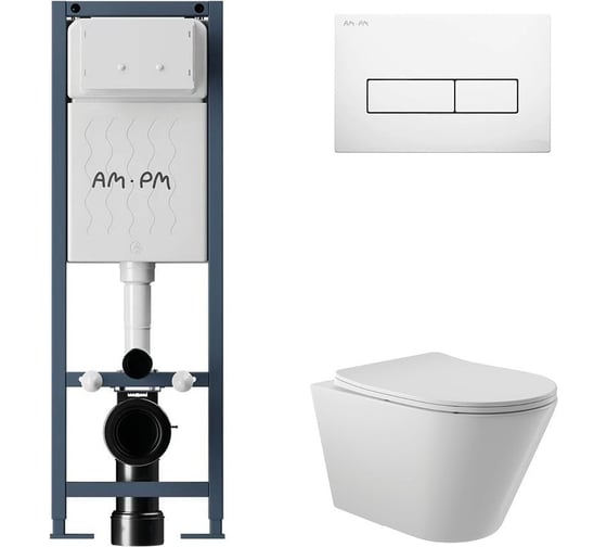 Комплект AM.PM I012711.0301 ErgoFit инсталляция для унитаза с клавишей ErgoFit M пластик, белый глянцевый + унитаз Long 525х360 безободковый, Vortex (Торнадо), Soft-Close, белый глянцевый, конус I012711.0301CV2110