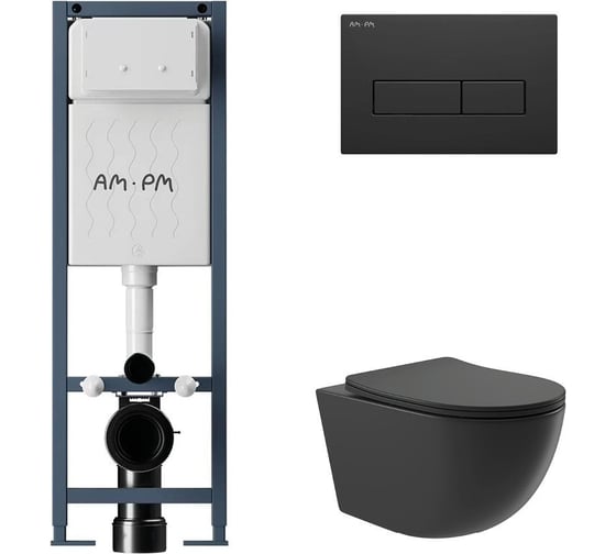 Комплект AM.PM I012711.0338 ErgoFit инсталляция для унитаза с клавишей ErgoFit M пластик, черный матовый + унитаз Long 525х360 безободковый, Vortex (Торнадо), сиденье Soft-Close, черный матовый, овал I012711.0338OV2140