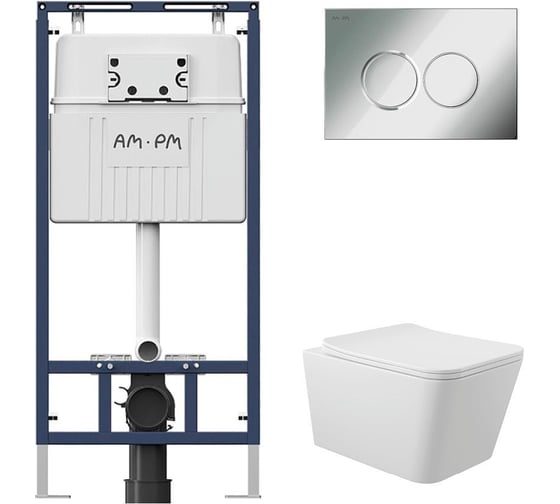 Комплект AM.PM MasterFit инсталляция для подвесного унитаза с клавишей ProC L, хром глянцевый + унитаз подвесной Long 520х370 безободковый, Vortex (Торнадо), Soft-Close, белый глянцевый, квадрат I012710.0151QV2110