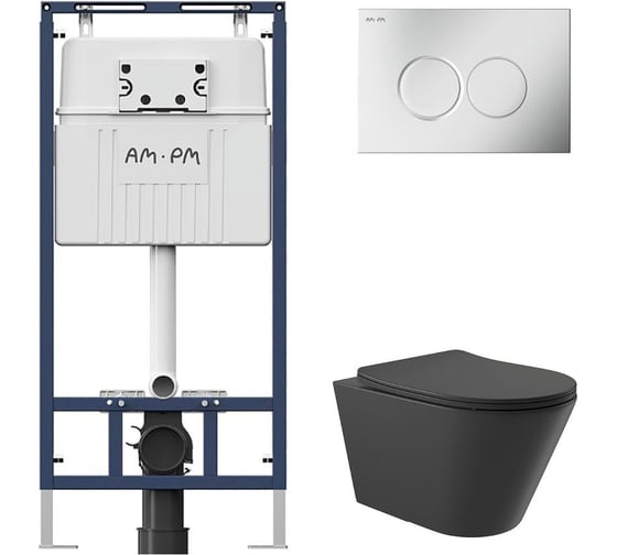 Комплект AM.PM MasterFit инсталляция для подвесного унитаза с клавишей ProC L, хром матовый + унитаз подвесной Long 525х360 безободковый, Vortex (Торнадо), Soft-Close, черный матовый, форма конус I012710.0131CV2140