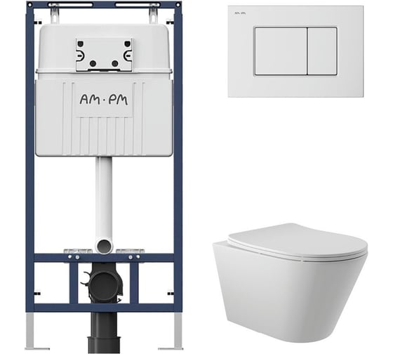 Комплект AM.PM MasterFit инсталляция для подвесного унитаза с клавишей ProC S, белый глянцевый + унитаз подвесной Long 525х360 безободковый, Vortex (Торнадо), Soft-Close, белый матовый, форма конус I012710.0201CV2120