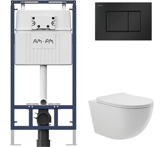Комплект AM.PM MasterFit инсталляция для подвесного унитаза с клавишей ProC S, черный матовый + унитаз подвесной Long 525х360 безободковый, Vortex (Торнадо), Soft-Close, белый глянцевый, форма овал I012710.0238OV2110