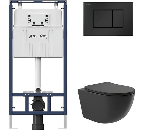 Комплект AM.PM MasterFit инсталляция для подвесного унитаза с клавишей ProC S, черный матовый + унитаз подвесной Long 525х360 безободковый, Vortex (Торнадо), Soft-Close, черный матовый, форма овал I012710.0238OV2140