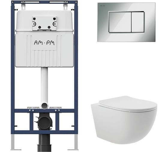 Комплект AM.PM MasterFit инсталляция для подвесного унитаза с клавишей ProC S, хром глянцевый + унитаз подвесной Long 525х360 безободковый, Vortex (Торнадо), Soft-Close, белый матовый, форма овал I012710.0251OV2120