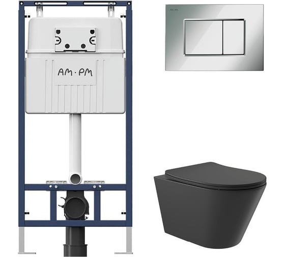 Комплект AM.PM MasterFit инсталляция для подвесного унитаза с клавишей ProC S, хром глянцевый + унитаз подвесной Long 525х360 безободковый, Vortex (Торнадо), Soft-Close, черный матовый, форма конус I012710.0251CV2140