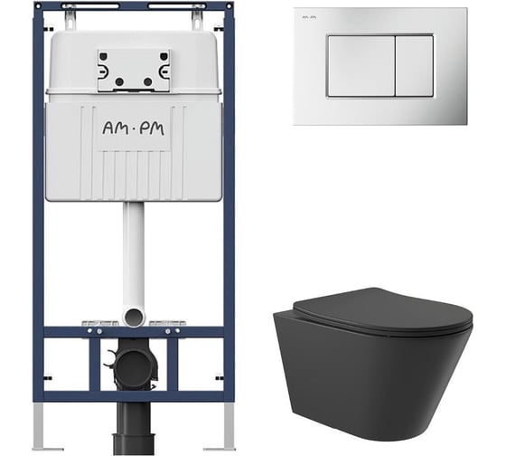 Комплект AM.PM MasterFit инсталляция для подвесного унитаза с клавишей ProC S, хром матовый + унитаз подвесной Long 525х360 безободковый, Vortex (Торнадо), Soft-Close, черный матовый, форма конус I012710.0231CV2140