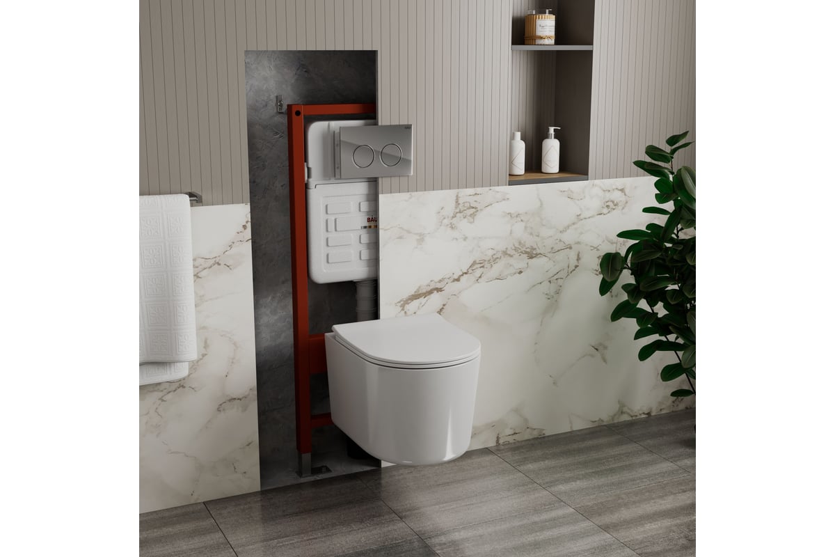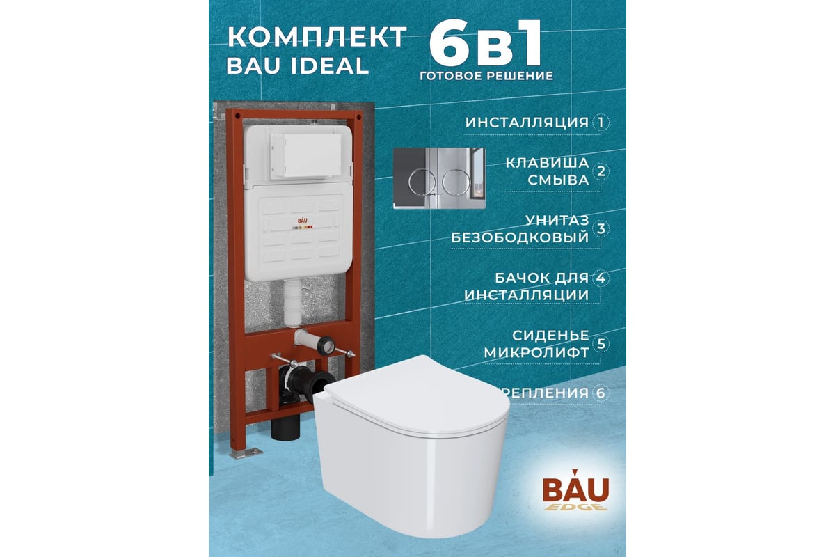 Комплект BAU 6 в 1 Bauedge: усиленная инсталляция BAU IDEAL, унитаз подвесной безободковый Bau Hotel PRO, сиденье микролифт, клавиша BAU Round, хром E458103-NM0003-PRO-E00113