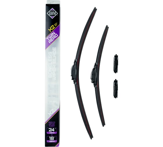 AWM Twin Aero - комплект из 2-х бескаркасных щеток AWM. Комплект включает в себя 2 щетки, размеров 24 и 18 дюймов, и 2 набора адаптеров, подходящих на крепления Крючок и VATL 5.1.