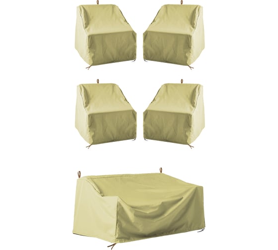 В комплект входят четыре чехла (1210х1010х1000/750 мм) для кресел и чехол (1800х1000х800/550 мм) для дивана, выполненные из ткани оксфорд 240, обладающей грязе- и водоотталкивающими свойствами.