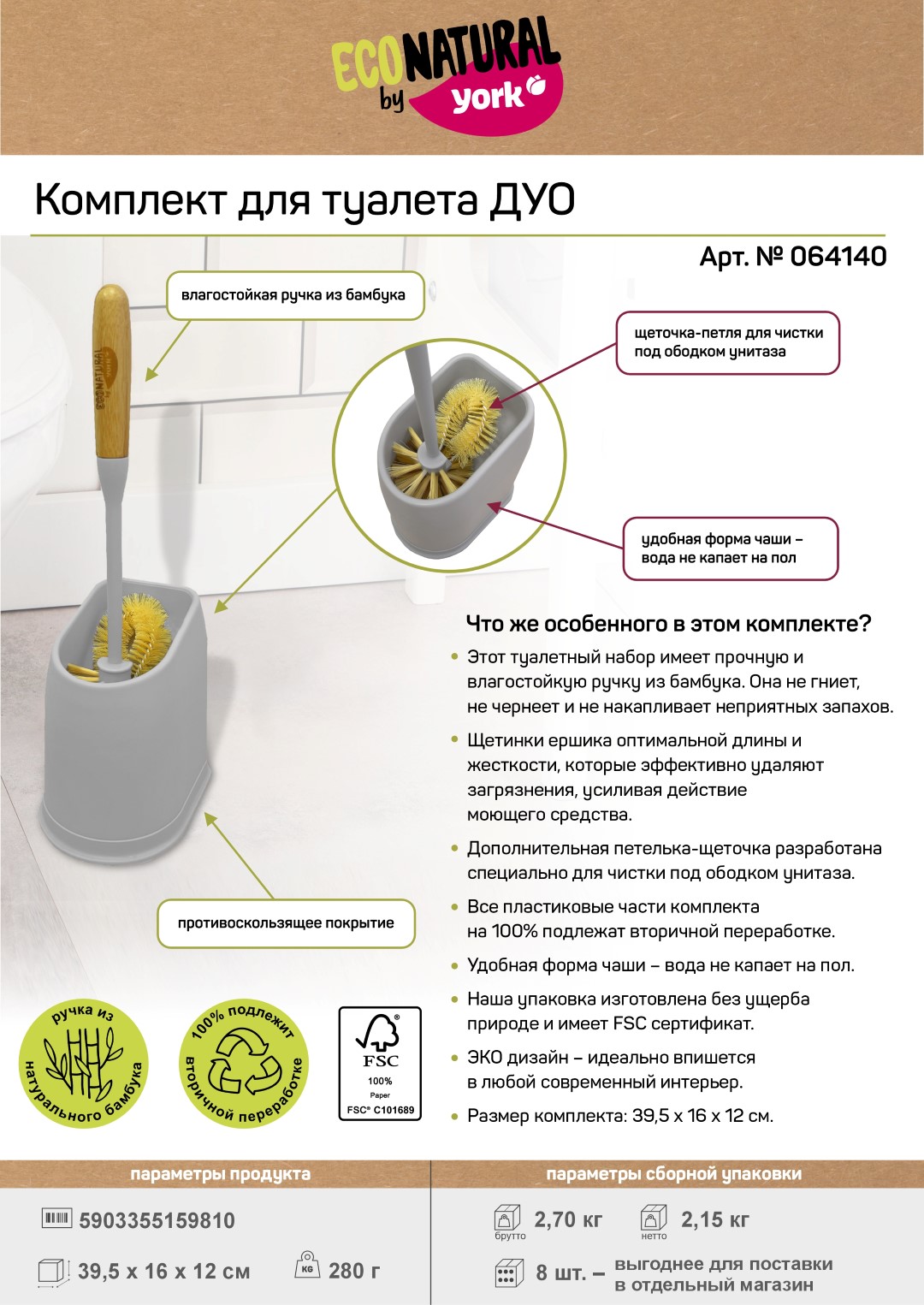 Туалетный набор имеет ёршик с дополнительной петлёй для очищения под ободком унитаза и чаши прямоугольной формы из прочного пластика. Ёрш оснащен влагостойкой ручкой из бамбука - не гниет, не чернеет и не накапливает неприятных запахов. Щетинки ершика оптимальной длины и жесткости, которые эффективно удаляют загрязнения, усиливая действие моющего средства. Дополнительная петелька-щеточка разработана специально для чистки под ободком унитаза. Все пластиковые части комплекта на 100% подлежат вторичной переработке. Удобная форма чаши – вода не капает на пол. ЭКО дизайн – идеально впишется в любой современный интерьер.