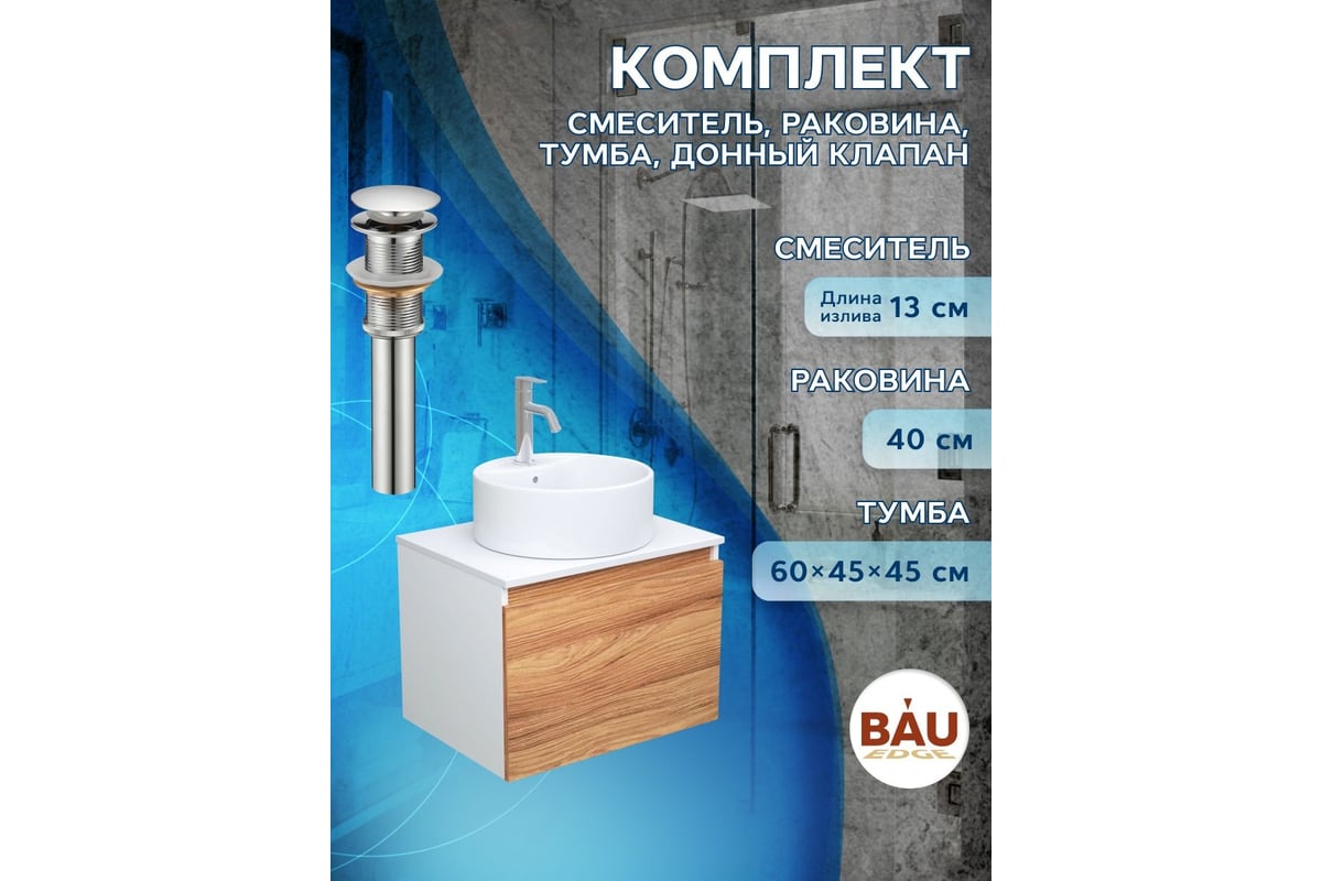 Комплект для ванной Bauedge 4 предмета (тумба Bau Dream 60 + раковина BAU D40, с отв. под смеситель + смеситель Dream, выпуск клик-клак, хром) BD1860