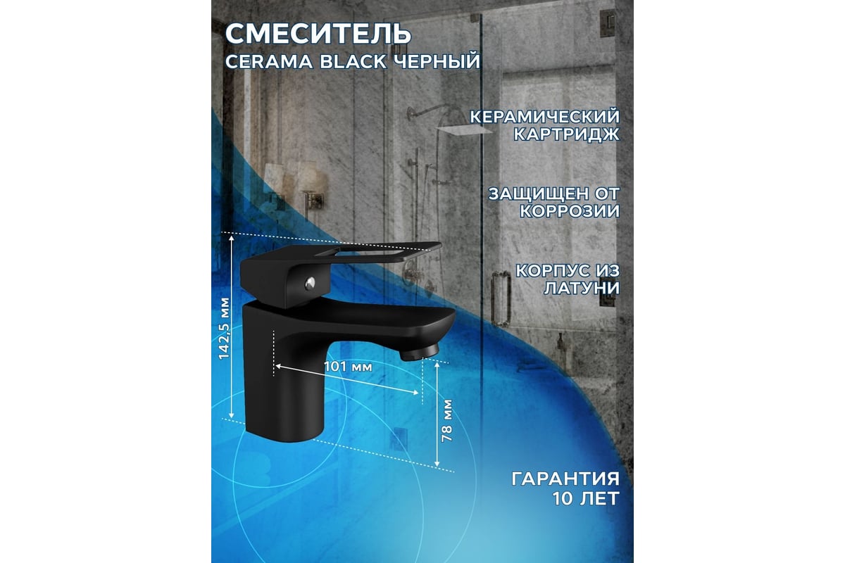 Смеситель для умывальника Cerama Black, черный предназначен для подачи горячей и холодной воды в ванных помещениях. Модель оснащена керамическим картриджем, обеспечивающим плавный ход рычага смесителя, контроль и точность при выборе напора и температуры воды. Изделие выполнено из латуни, отличающейся прочностью, долговечностью и устойчивостью к перепадам температур. Подходит для всех накладных раковин на столешницу брендов WELTWASSER, Grossman, Gappo, Ceramica Nova, Gid, Teymi, CeramaLux, IDDIS, Laguraty, Kirovit, Azario и других.
