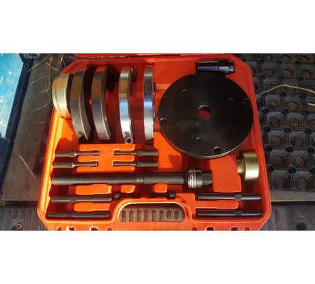 Начитавшись интернета, купил набор за 8200руб. для замены передней ступицы ФФ2.Уважаемые фокусоводы!Скупой платит дважды, поэтому решайте сами покупать или нет после прочтения моей истории! 1.при фиксировании черных полудисков(для выпрессовки) на ступице болты закрутились всего на 2 оборота!, в связи с чем, при выпрессовке ступицы резьбу м8 в полудиске срезало(теперь планирую просверлить насквозь и нарезать резьбу дальше)! 2.При монтаже полудисков(блестящих) для запрессовки на новую ступицу пришлось сточить на них небольшую фаску на наждаке, т.к. не соединялись), и купить болты по-длиннее.В магазине под шестигранник болтов не нашлось, купил обыкновенные под ключ "13" с прочностью 8.8, пропилил паз под шлиц отвертки для затягивания и подточил грани для возможности завернуть.Для установки упорной шайбы в кулаке пришлось ехать к токарю уменьшать её посадочный диаметр с 76мм до 73,8мм. При запрессовке не выдержали и согнулись болты м8, полудиски тоже деформировались(потом выправил как смог в прессе).Но в конце концов новую ступицу запрессовал!Фото до использования.За такие деньги- не рекомендую!