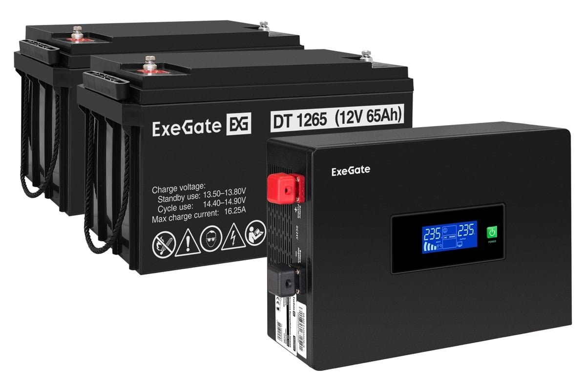 Комплект ExeGate ИБП EX295994RUS + батарея 65Aч EX282980RUS 2шт инвертор, синус, для котла, PF=1, настенный IdealSine SR-1500.LCD.2SH 1500VA/1500W 297435