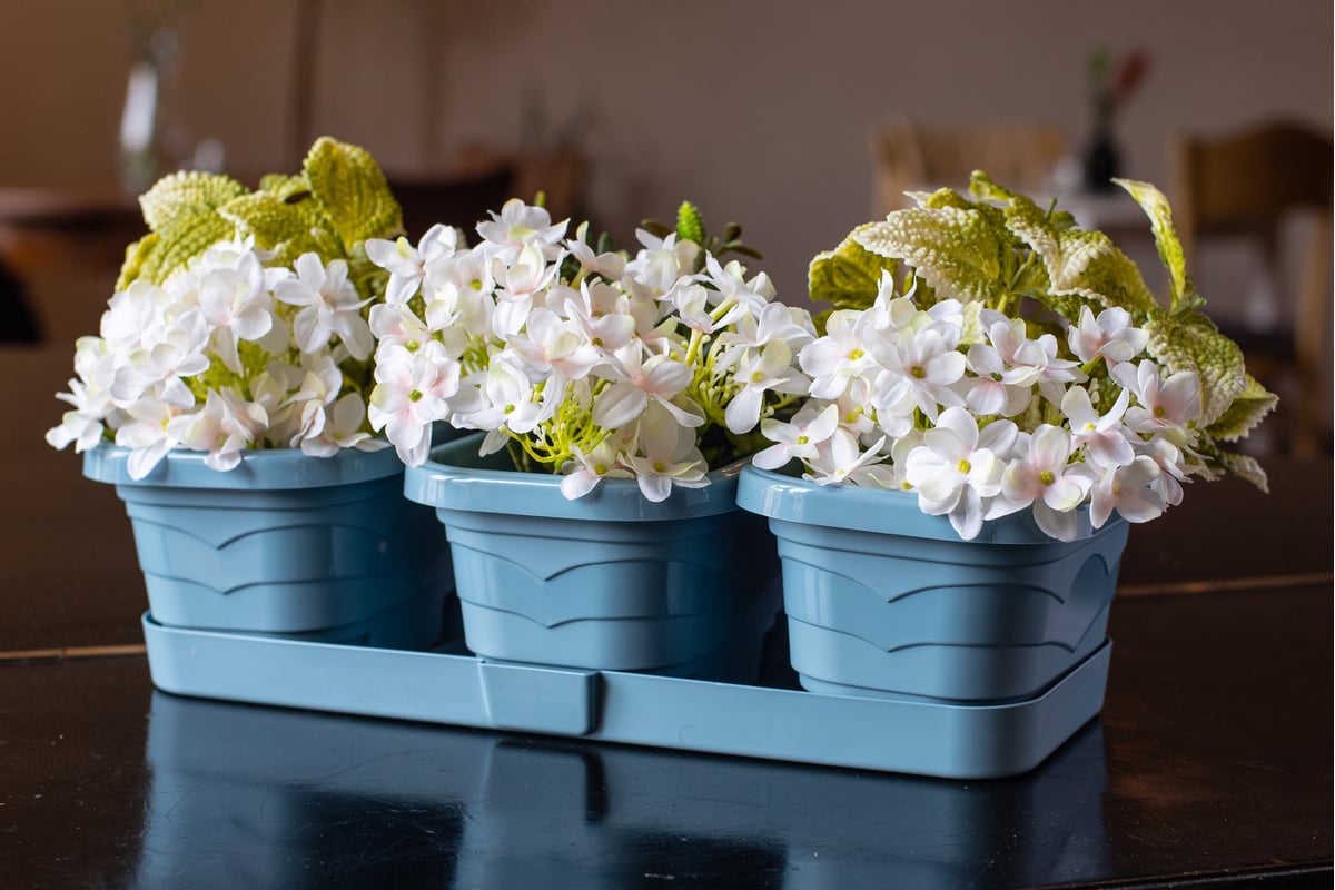 Комплект из 3-х горшков с поддоном 5Plast Цветочное трио Валенсия ментол 5PL0475 используется для выращивания комнатных культур. Благодаря сдержанному дизайну горшок не только подчеркнет красоту растения, но и отлично впишется в интерьер. В комплект входит поддон, он собирает излишки жидкости при поливе, тем самым сохраняя чистоту вокруг. Горшок выполнен из пластика, он неприхотлив в уходе и подойдет для многоразового использования.