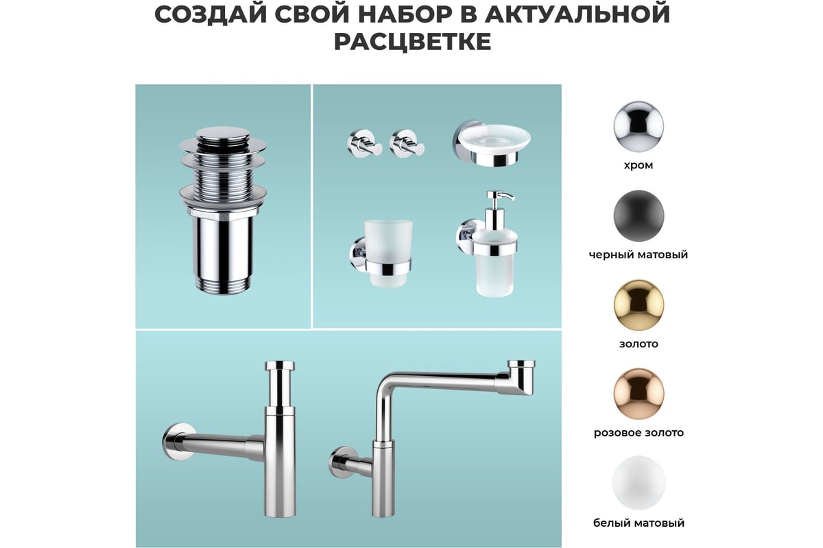 Завершить современный интерьер ванной комнаты можно с помощью сифона, донного клапана, угловых вентилей (2 шт), набора аксессуаров (5 шт) и элегантными зеркалами 7 Rays' Spectrum.