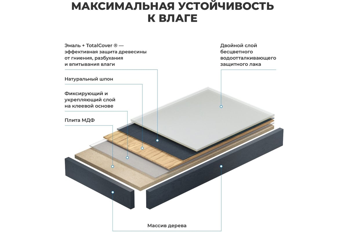 - Основа столешницы из дерева Genuine Tree – высококачественная импрегнированная плита МДФ, пропитанная специальным составом для усиления стойкости материала и максимальной защиты от влаги, перепадов температур, грибка и плесени Максимальная влагостойкость достигается за счет укрепления торцов изделия массивом дерева Далее поверхность столешницы покрывается натуральным шпоном, что позволяет получить высокую износостойкость