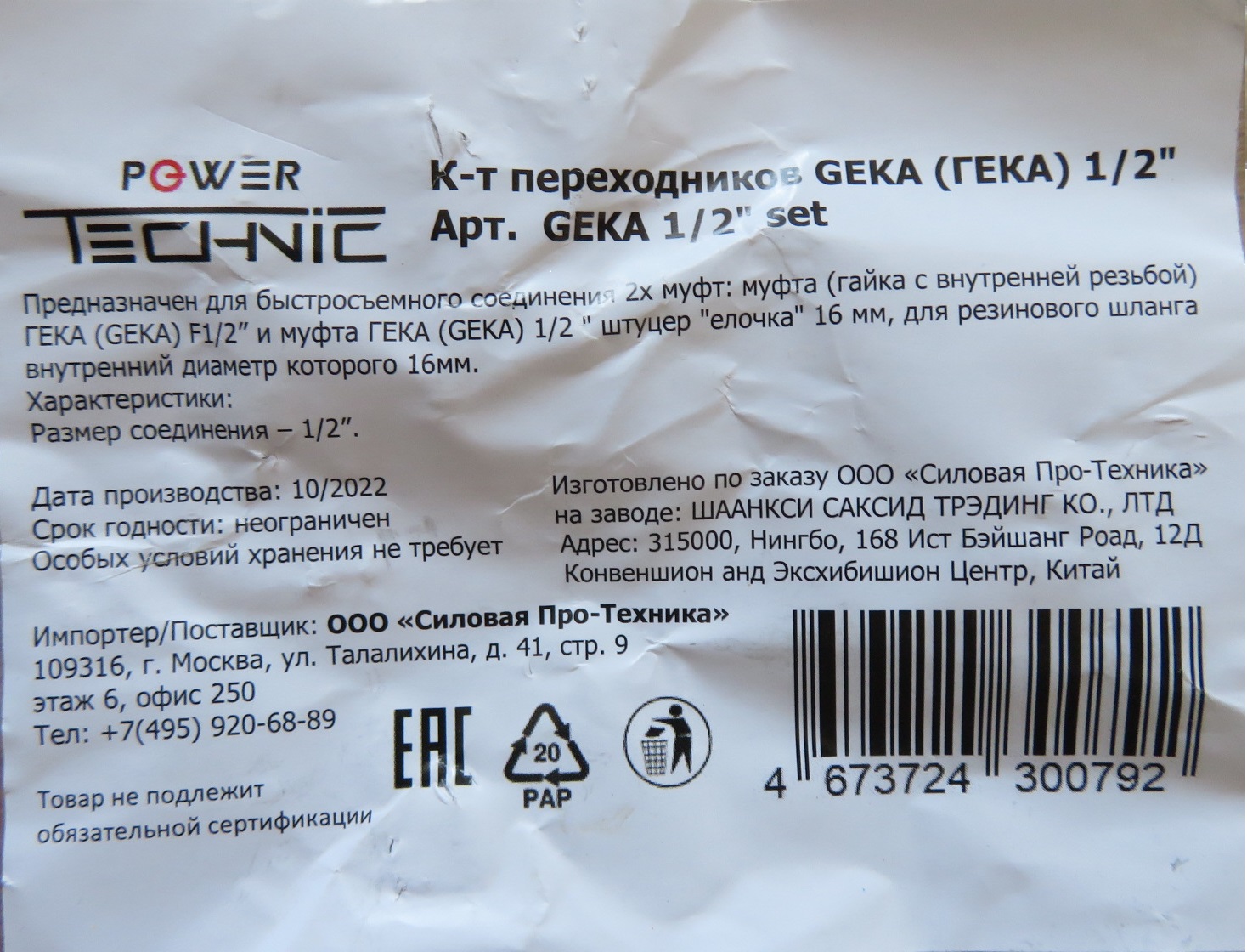 Комплект POWER TECHNIC GEKA (ГЕКА) переходников 1/2. Состав: Муфта GEKA (ГЕКА) F1/2 с внутренней резьбой, штуцер елочка 16мм. GEKA 1/2" К-т