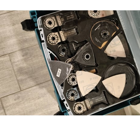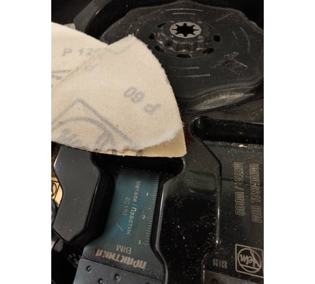 Пара нюансов (не недостатков). 1. На некоторых скоростях вибрации, некоторые пилки начинают вибрировать не в одной, а в двух плоскостях на холостом ходу. Это, скорее всего, не недостаток оснастки, а особенности вибрационного режима работы на резонансных частотах. Просто устанавливаем меньшую или большую частоту вибрации и получаем удовольствие от работы. 2. При работе с наждачкой сначала на инструменте закрепляется соответствующий держатель, а затем, на этот держатель присоединяется наждачка. Съём осуществляется в обратной последовательности. То есть невозможно сразу насадить/снять держатель вместе с наждачкой. Можно, конечно, вырезать отверстие в центре наждачной бумаги, но это приведёт к тому, что абразив и частички обрабатываемого материала будут загрязнять узел крепления оснастки в инструменте. Так что, в наборе всё сделано по уму!