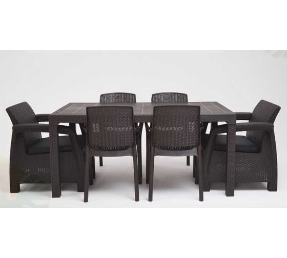 Состав комплекта:Кресла - 2 шт; большой обеденный стол - 1 шт.; регулировочный болт для ножки стола - 1 шт.; стул садовый - 4 шт.; подушка для кресла - 2 шт.
