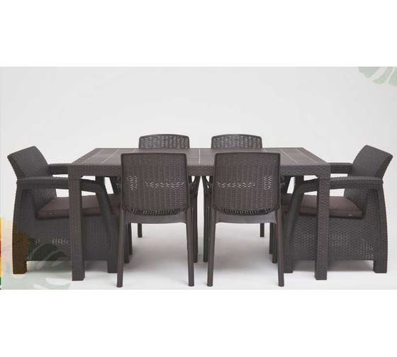 Состав комплекта:Кресла - 2 шт; большой обеденный стол - 1 шт.; регулировочный болт для ножки стола - 1 шт.; стул садовый - 4 шт.; подушка для кресла - 2 шт.
