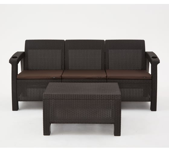 Фазенда-3 (3-х местный диван + кофейный столик), мокко, без подушек. Преимущества:Эргономичный дизайн. Сделано из прочного пластика Неметаллическая рама - не ржавеет и не гниёт. Простая сборка без навыков. Благодаря стойкому к высоким температурам полипропилену, цвета не выгорают и не бледнеет. Легко мыть и удобно хранить. Встроенные подстаканники