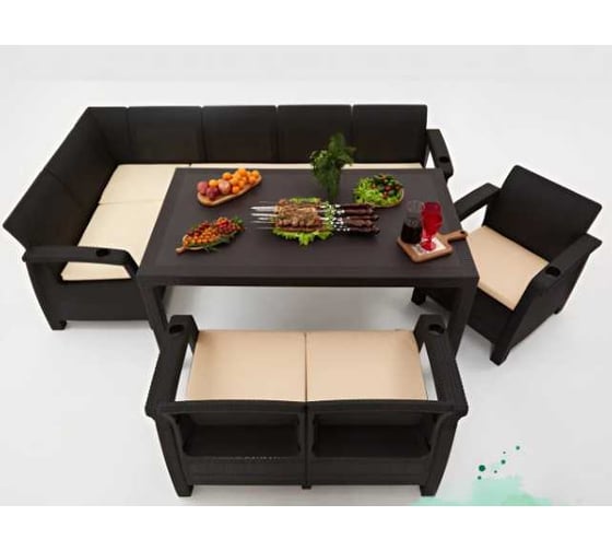 Состав комплекта:Диван угловой - 1 шт.; Диван 2х местный - 1 шт; Большой обеденный стол - 1 шт.; Кресло - 1 шт.; Подушки для садовой мебели - 8 шт.
