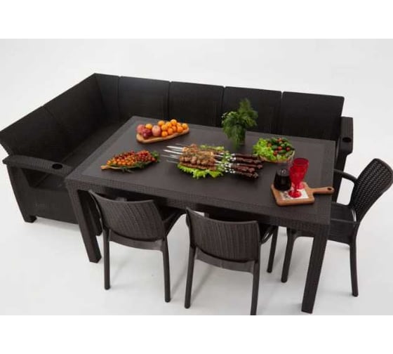 Состав комплекта:Диван угловой - 1 шт.; Большой обеденный стол - 1 шт., регулировочный болт на ножку стола - 2шт.; Стул садовый - 3 шт.; Подушки для садовой мебели - 5 шт.