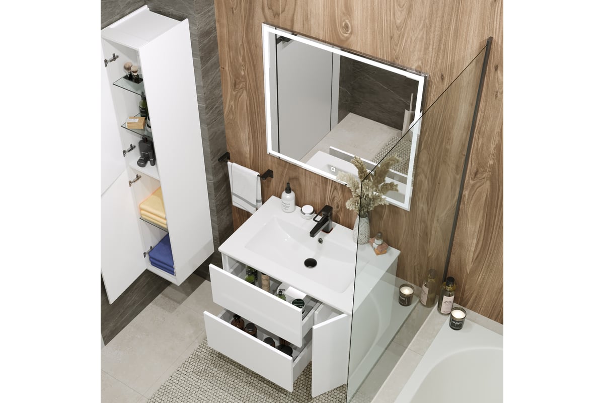 Два выдвижных ящика с направляющими скрытого монтажа и доводчиками. Количество полок без учета корпуса мебели 1. Одна дверца с доводчиками, открывающаяся вправо. В комплект входят крепления к стене.