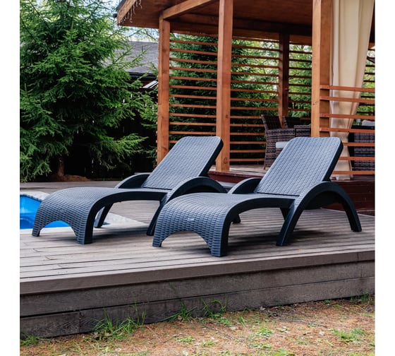 Комплект шезлонгов MARK с плетением под искусственный ротанг. Изготовленный из прочного пластика, шезлонг сочетает в себе элегантность плетеного дизайна и практичность: он устойчив к влаге, ультрафиолету, перепадам температур и коррозии, сохраняя безупречный вид даже при круглогодичной эксплуатации. Идеальное решение для зон отдыха!