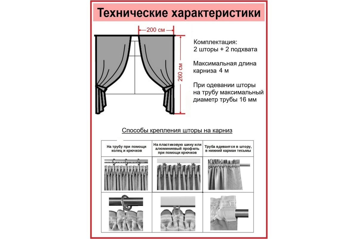 Комплектация - 2 шторы по 400 см шириной и высотой 260 см, 2 подхвата