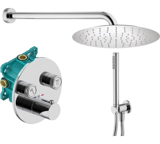 - KITPSB1902CR Комплект встраиваемого термостатического смесителя для душа, 2 выхода с внутренней частью PSB003, кнопочное переключение с регулировкой расхода, накладка нержавеющая сталь d. 160 Plumberia Selection