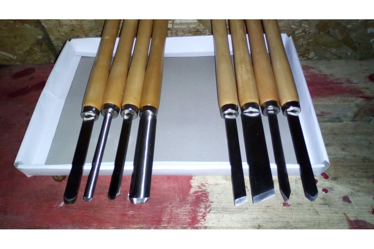 Всем добрый день! Я начинающий токарь по дереву, купил себе станок для хобби. Прочитал все отзывы об этом наборе, решил попробовать купить. Набор хороший, разные резцы для разных типов работ. Сразу решил закалить и заточить. Обратился в ПГНИУ на каф. материаловедения для определения стали и твердости. Резцы сделаны из стали 65Г, твердость 15HRC, что несомненно мало даже для работы по дереву. Закаливать при Т=830град. С в масло (можно в полимер), выдержка 40-60 мин. Отпуск 200град. С, 1 час. Закаливал я в цехе одного предприятия (Дай Бог здоровья Директорам и термисту) Получившаяся твердость 45HRC, что конечно тоже мало, но для дерева пойдет. Если у вас есть возможность сделать закалку на более профессиональном оборудовании, то может получиться твердость до 58-60 HRC. Резцы при этом темнеют. Всего доброго!