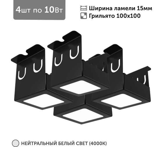 Светильник для грильято 4шт по 10Вт 4000К для ячейки 100x100 мм ширина ламели 15 черный встраиваемый Geniled 27151_4000_black