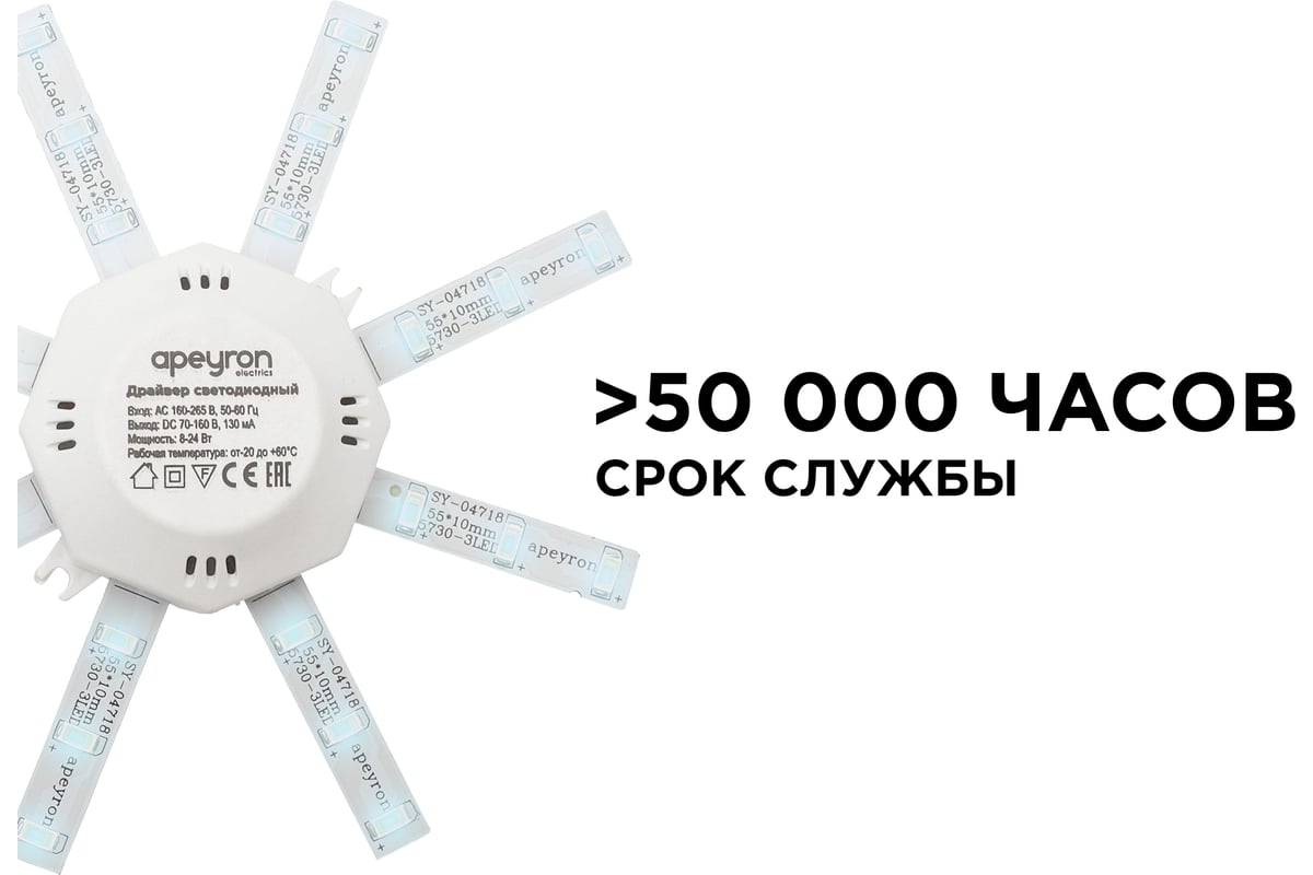 Преимущества Apeyron 220В, 8Вт, 6400К, д.140мм 12-15