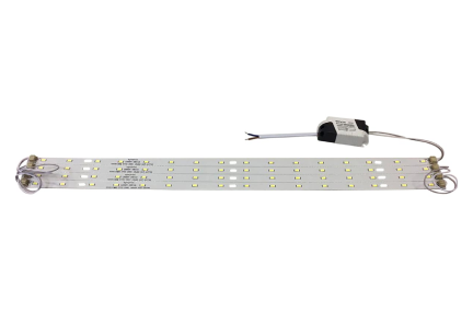 Драйвер контактирует с линейками только в месте их подсоединения, что позволяет улучшить охлаждение компонентов набора. Изделие работает от напряжения 220 В и не требует дополнительных устройств для подключения. Благодаря отсутствию мерцания светового потока отлично подходит для использования в жилых помещениях, а также административных, медицинских и производственных учреждениях.