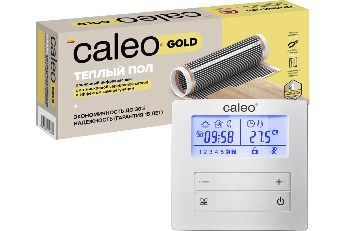 - Теплый пленочный пол CALEO Gold (Термопленка в рулоне; Контактные зажимы на каждый кв.м; Комплект электрической проводки; Битумная изоляция на каждый кв.м; Цветная инструкция по монтажу, включающая гарантийный талон.)