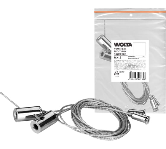 Комплект тросовых подвесов WOLTA 2шт длина тросов 1м MK-2 применяется для подвесного монтажа светильников или панелей на потолок и несущие конструкции здания. Трос изготовлен из стали и имеет самозажимные держатели, благодаря которым можно регулировать длину подвеса.