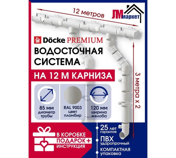 Комплект водосточной системы ЛМ маркет Docke Premium 1.5 м, пломбир 12/3 квс_деке_премиум_пломбир_12_3_фбс