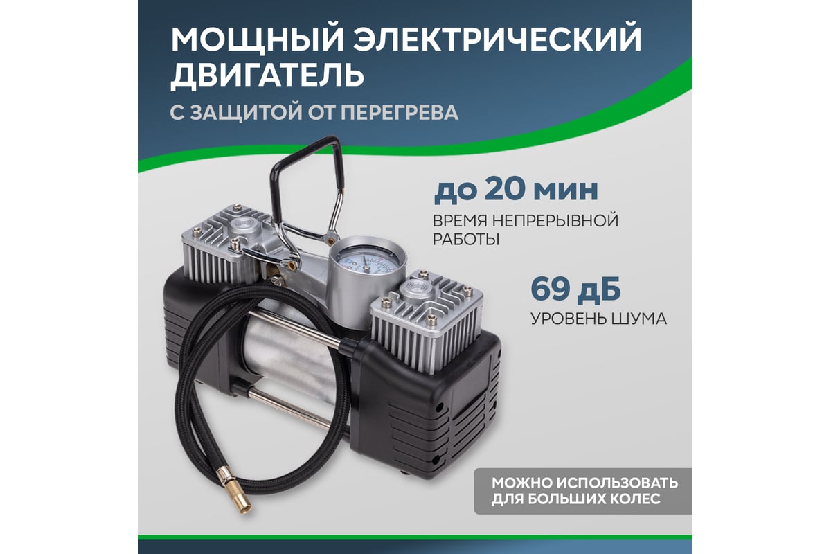 Используется для накачки шин легковых автомобилей, кроссоверов, внедорожников и малого коммерческого транспорта. Питание осуществляется от АКБ автомобиля. Компрессор обладает высокой производительностью 60 л/мин. Оснащен мощным электрическим двухпоршневым двигателем и системой повышенной безопасности. Предусмотрена защита от перегрева. Устройство рассчитано на длительную эксплуатацию в суровых климатических условиях. Может быть использовано для больших колес.