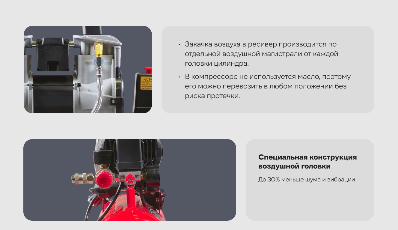 Отсутствие масла позволяет легко транспортировать компрессор в любом пространственном положении без риска протечек.