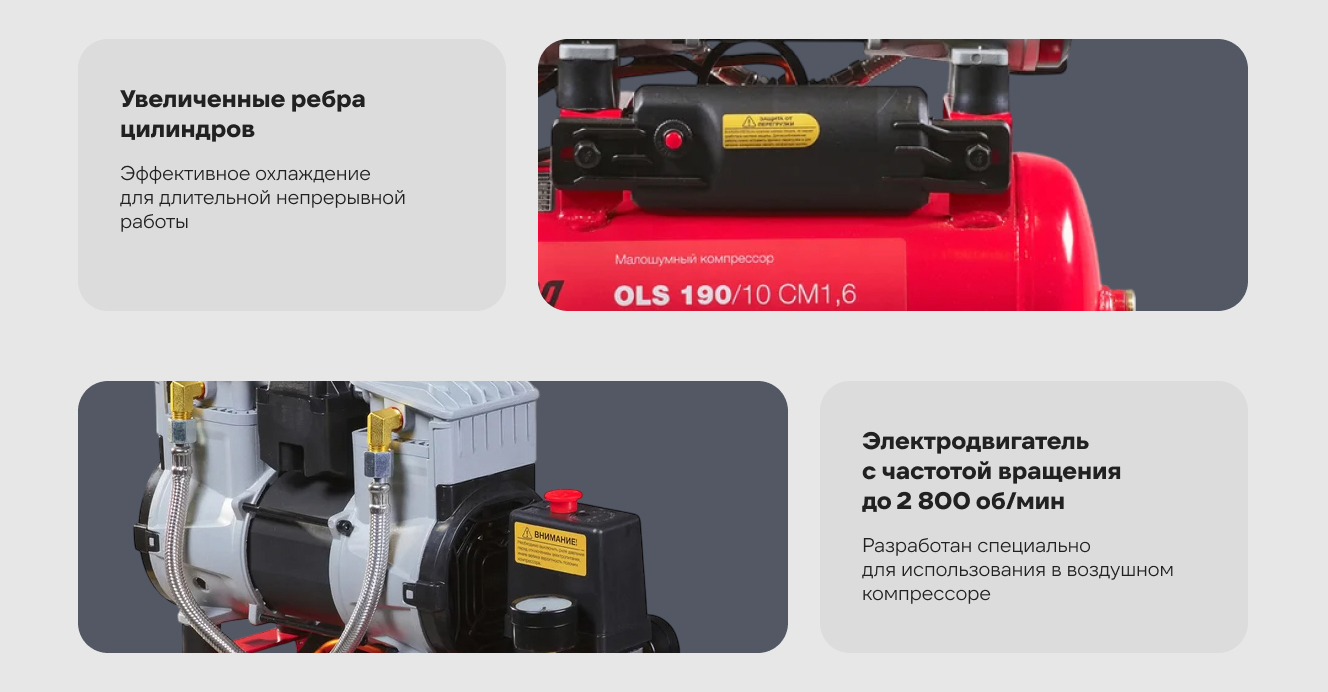 - 2 мощных вентилятора создают усиленный воздушных поток для снижения рабочей температуры компрессорной головки и двигателя