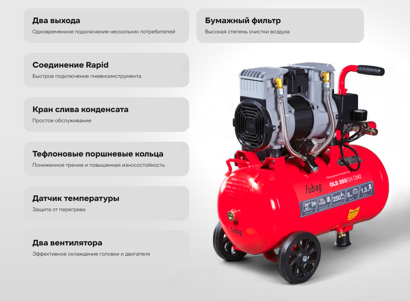 - 2 мощных вентилятора создают усиленный воздушных поток для снижения рабочей температуры компрессорной головки и двигателя