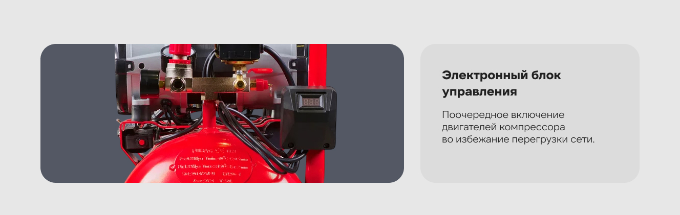 Электронный блок управления раздельным запуском двигателей. Снабжен функцией вольтметра и обеспечивает поочередное включение двигателей компрессора во избежание перегрузки сети. Электромагнитный клапан сброса давления для облегчения повторного запуска.