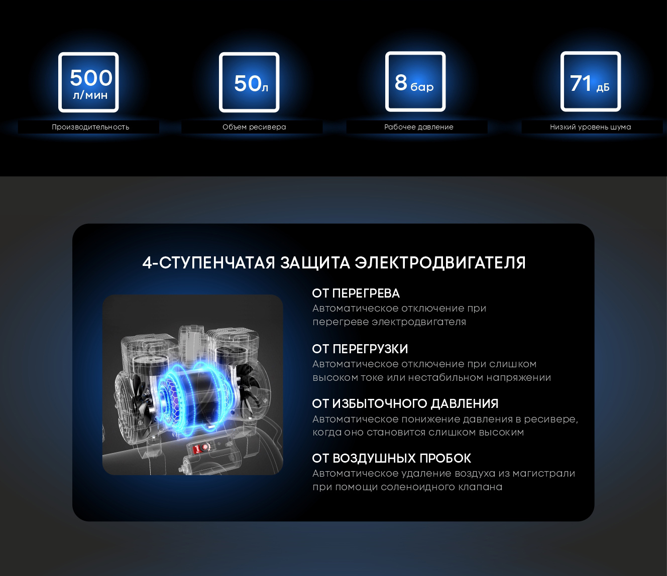 Компрессор классный! Но без доработки работать с ним не получится. Один вопрос к производителю. Неужели нельзя реализовать поочерёдный пуск моторов (задержки в 3-5 сек. вполне хватит) ???