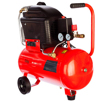 - Удобная транспортировкаКомпрессор имеет в основании колеса, а в передней части корпуса установлена рукоятка