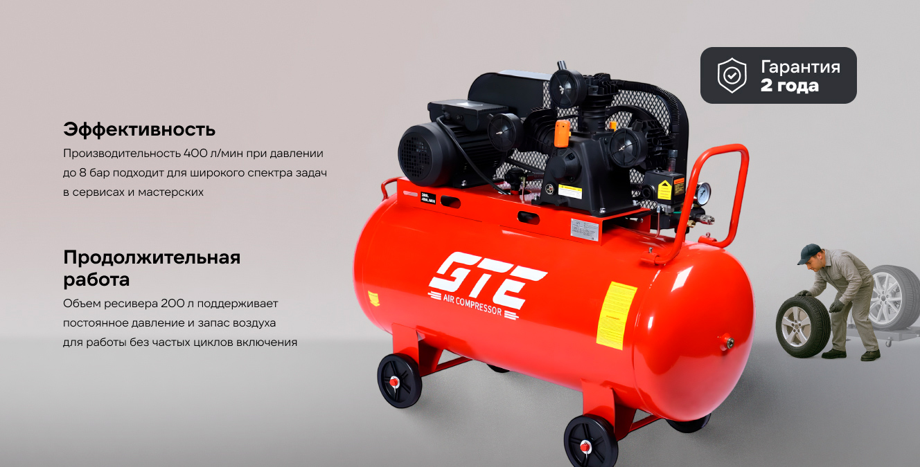 Компрессор поршневой с ременным приводом GTE 220В, ресив. 200л, 400л/мин. -MR4200400B GTE-MR4200400B